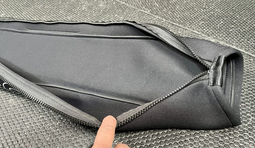 The zipper is on the back and the 1/2″ thick foam sits on the inside between the belt and my body.
