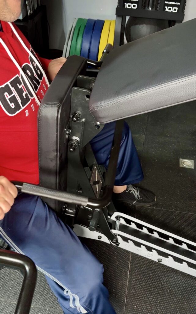 The open design allows me to drive my elbows as far back as I can without the attachment hitting the back of the bench.