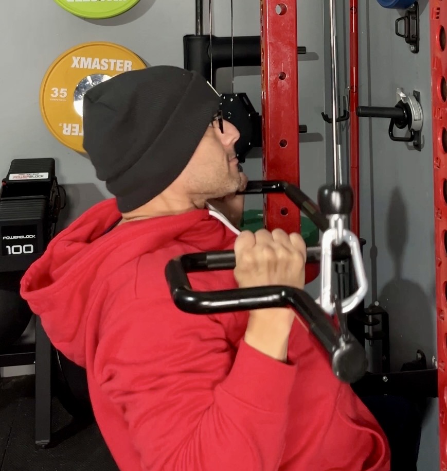 I pull the bar straight down with my arms moving past my body so I can get a full contraction on my lats.