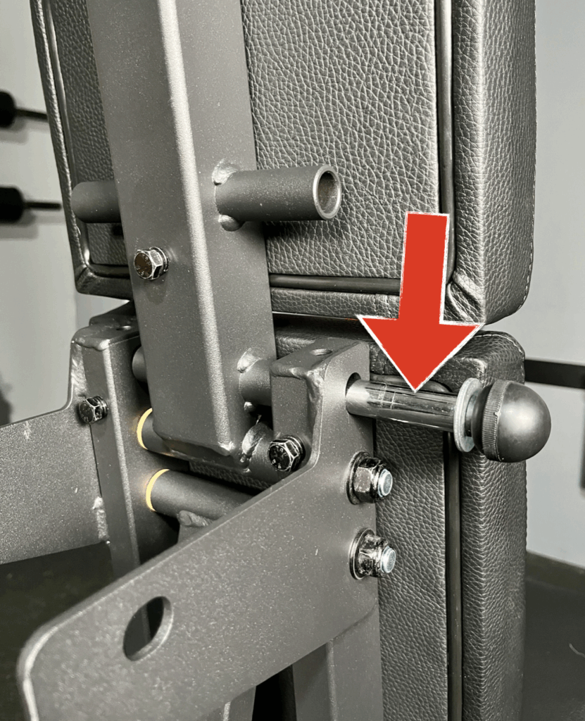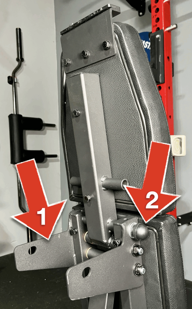 One unique feature that this bench has, is a small flip down arm (arrow 1) that locks the bench pad in place so it doesn’t move when it’s stored.