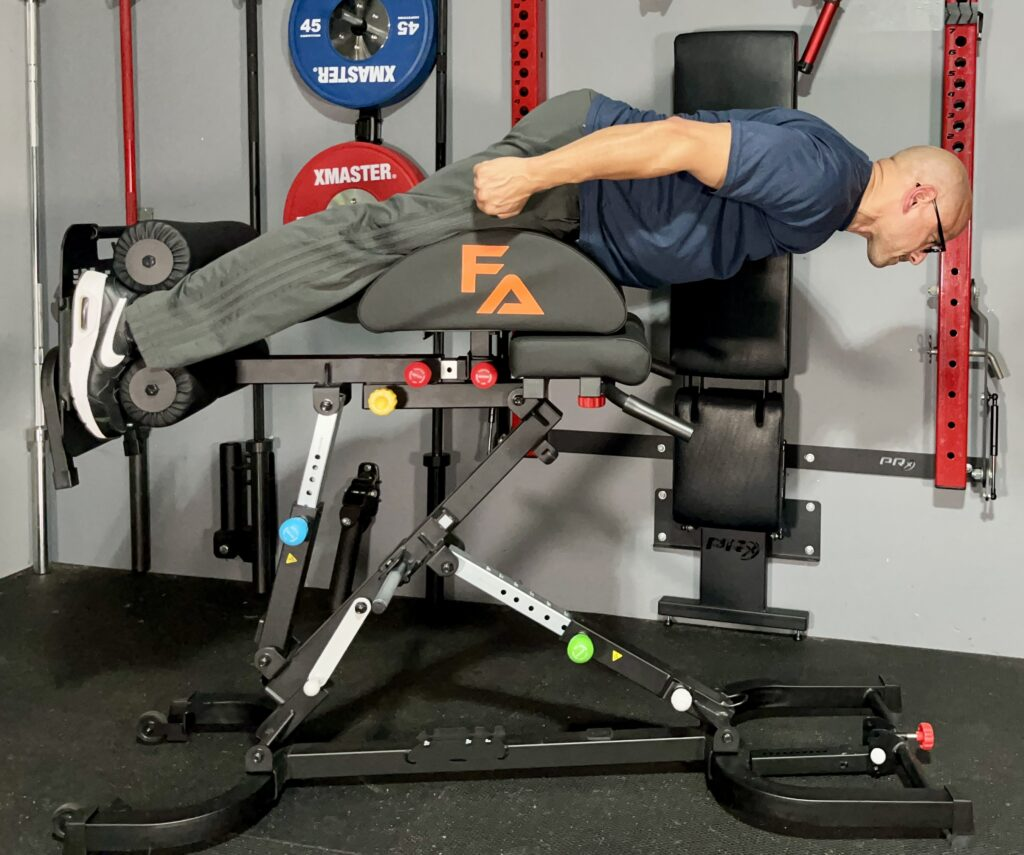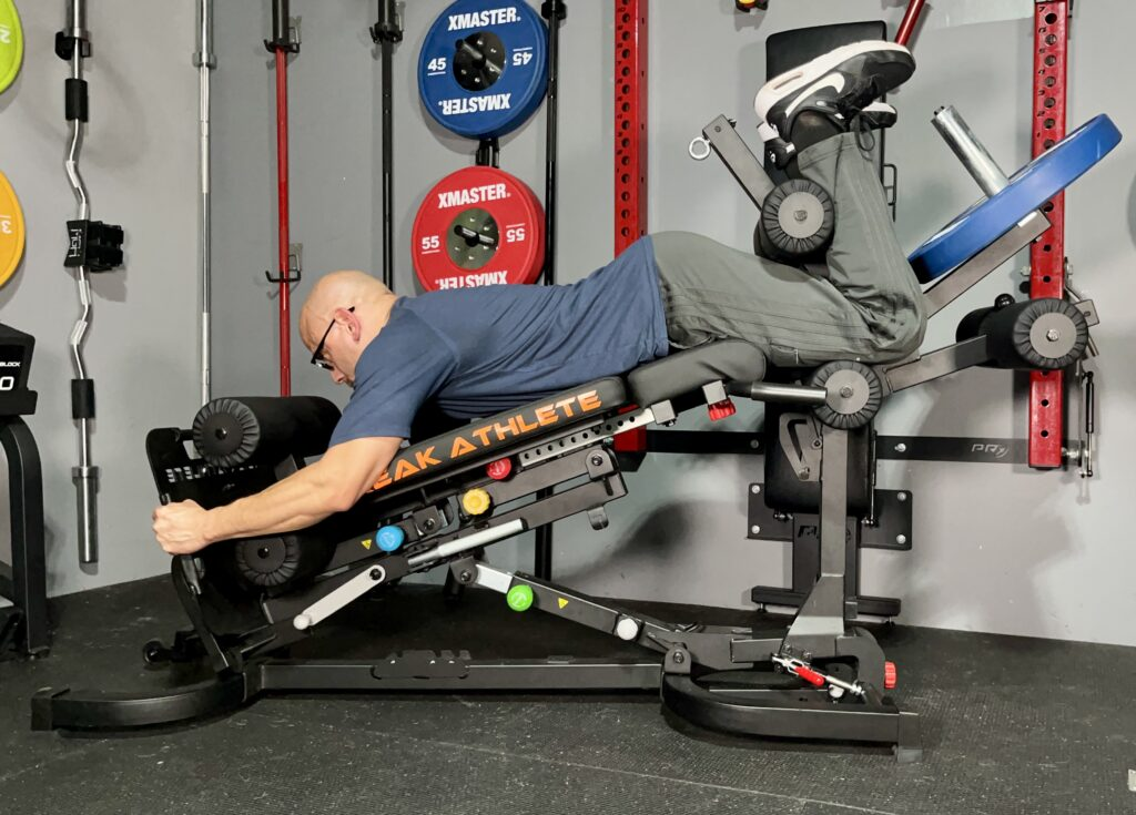 I incline the bench to open up space and insert the leg roller at the other end of the bench.