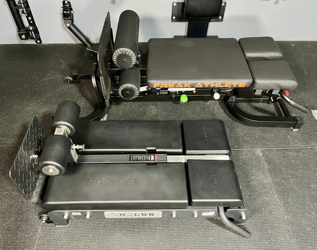 As far as Nordic curls go, both Nordic benches are adjustable so I can start at an angle and work my way down to a flat Nordic curl.