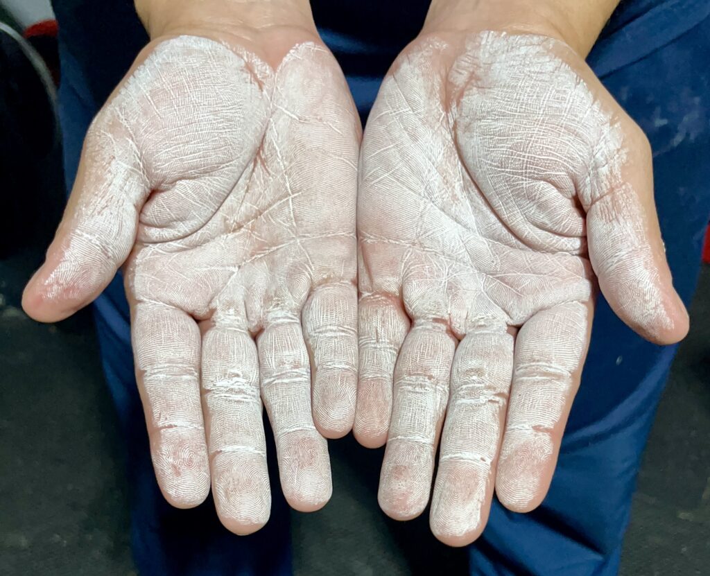 Chalk keeps my hands dry so I can hold on to a barbell or pullup bar safely.