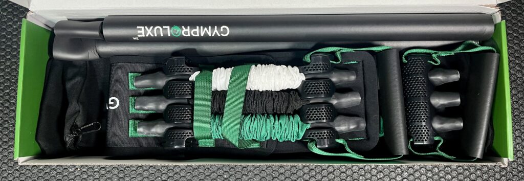 The Gymproluxe Band and Bar Set is a portable resistance bands system with variable resistance that allows me to train from home or on the go.