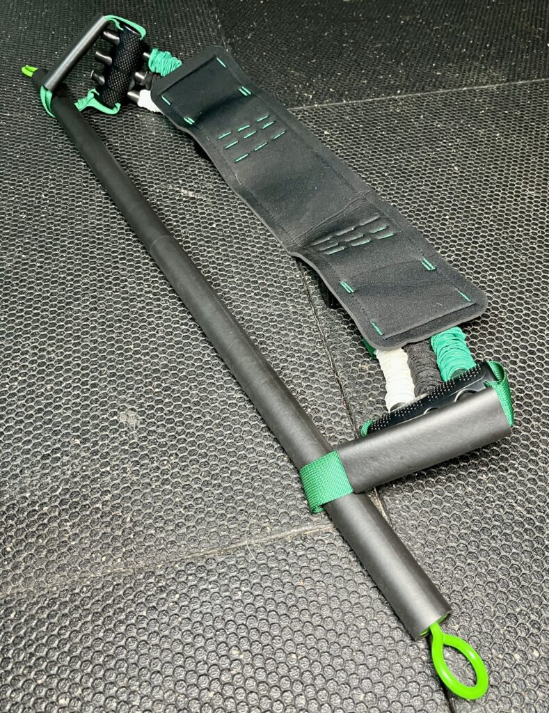 It uses resistance bands that are strapped to a belt and handles and can be adjusted to work as a single band or stacked to add more resistance.