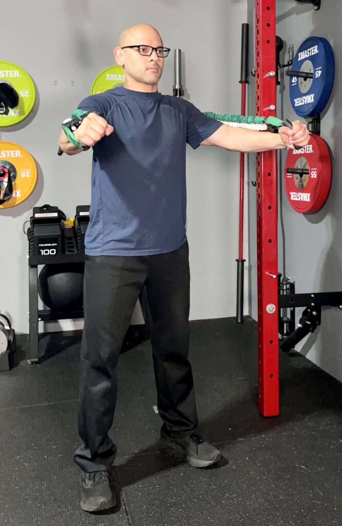 For this exercise to be effective, I need bands anchored off to the sides so they can provide resistance from the outside in.