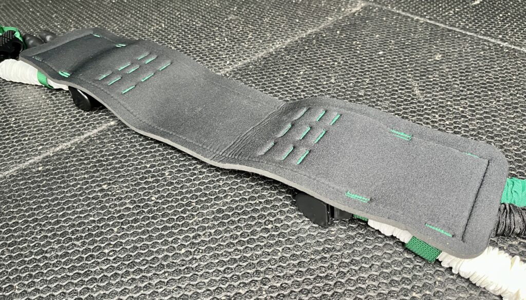 Each end of the belt has a handle with slots where I can anchor down the resistance bands.