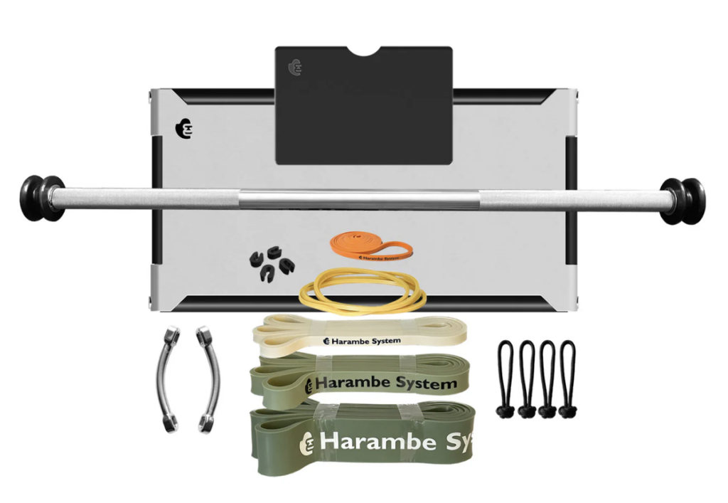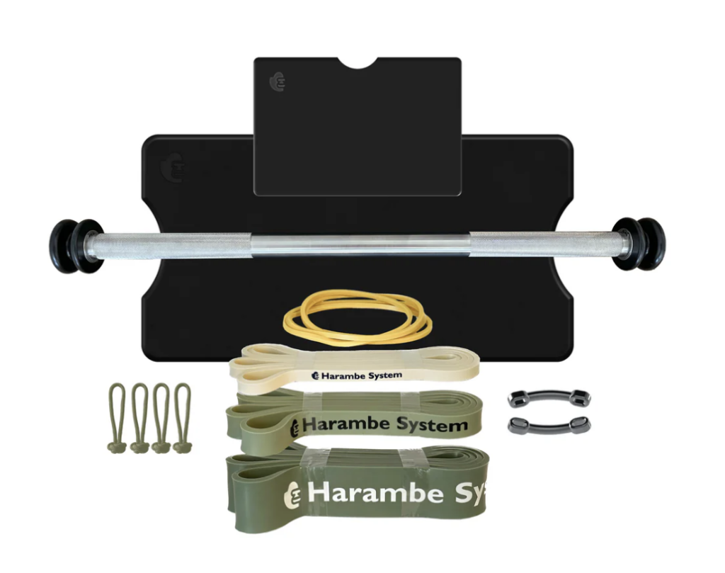 The Harambe System is a complete resistance band system that includes bands, a plate, a bar, and workout programs.
