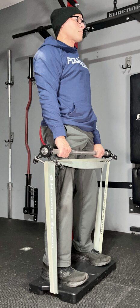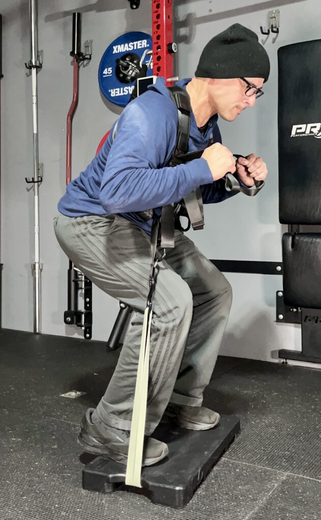 I prefer using my squat harness when doing squats with a double band because the shorter 38″ bands make it harder to put the bar on my shoulders.