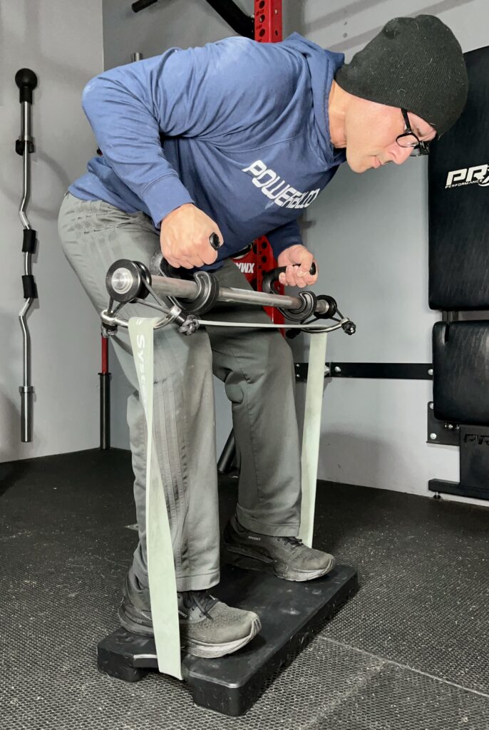 The other end goes across the bottom of the bar like you see above when I’m doing shoulder presses.