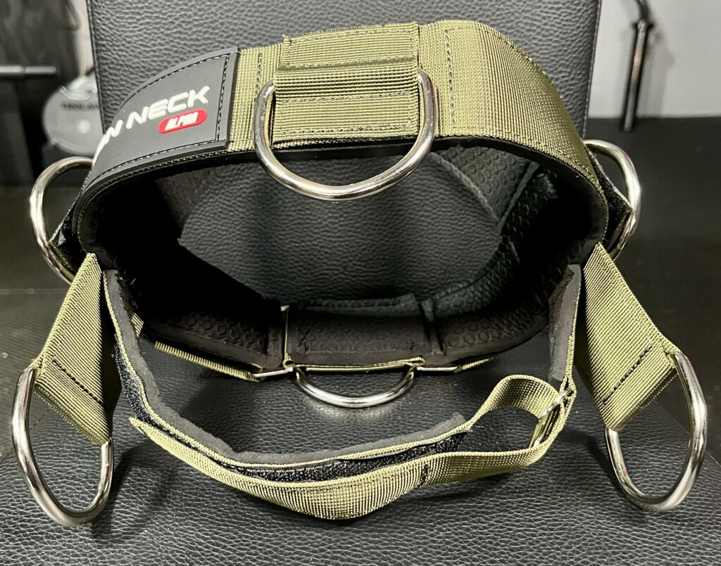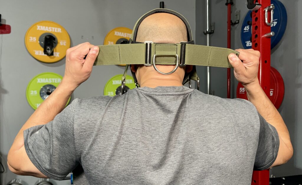 It’s made with a durable strap, heavy duty D-rings, and strong velcro so I can attach resistance bands or hang weight plates to do neck exercises from different angles.