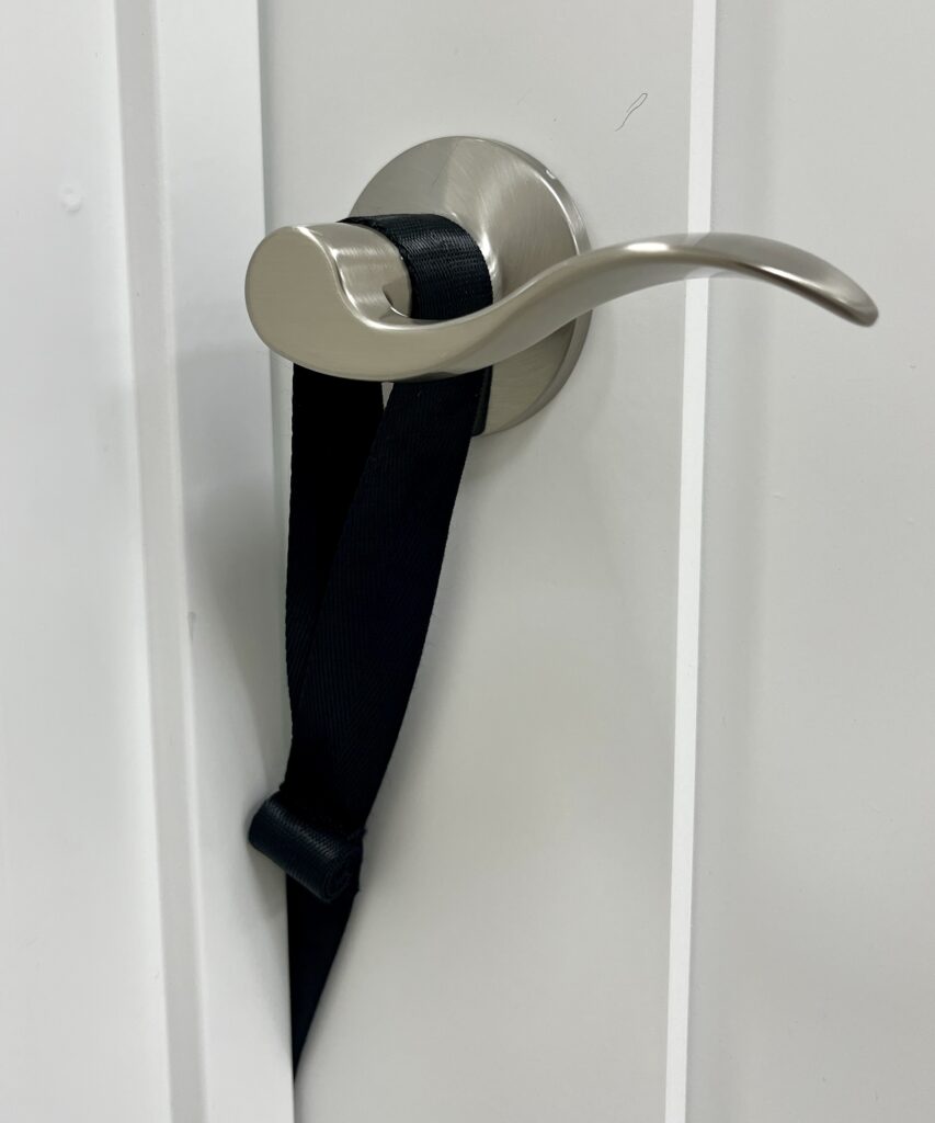 First, I’ll show you outside the door and the first thing I do is wrap the strap around the door knob.