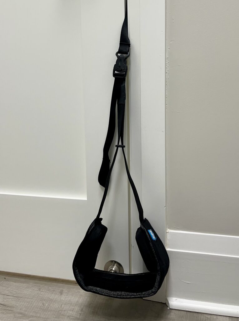 The Neck Hammock is a neck sling that you attach to a door or something sturdy like a post or weight rack to traction your neck.
