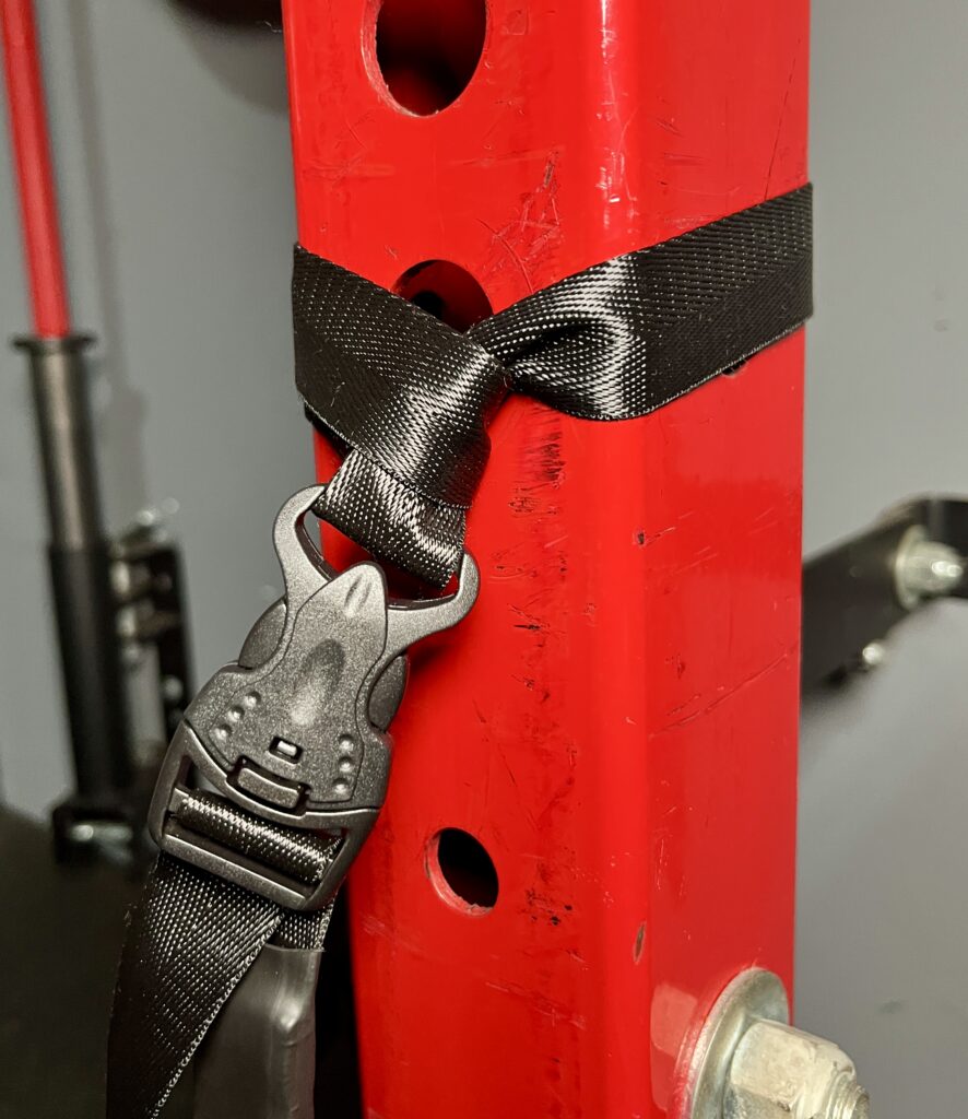To do that, I unclip the buckle from the hammock, wrap the strap around the post, thread it through the loop, and buckle up.