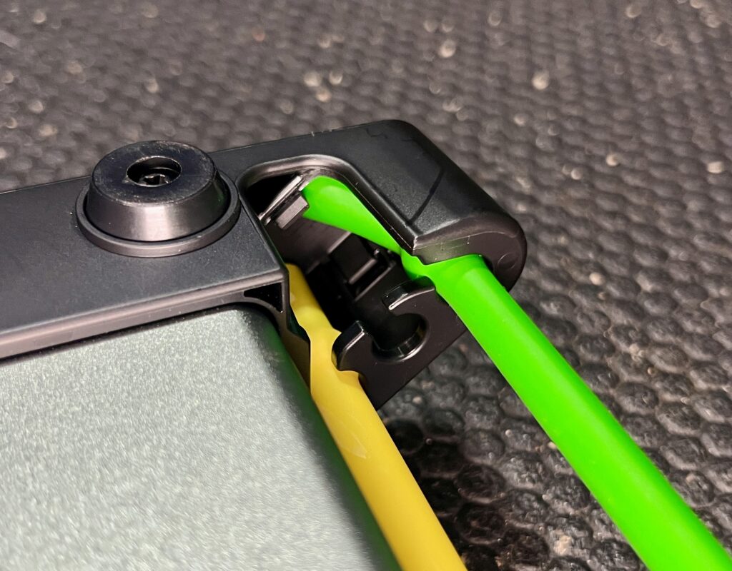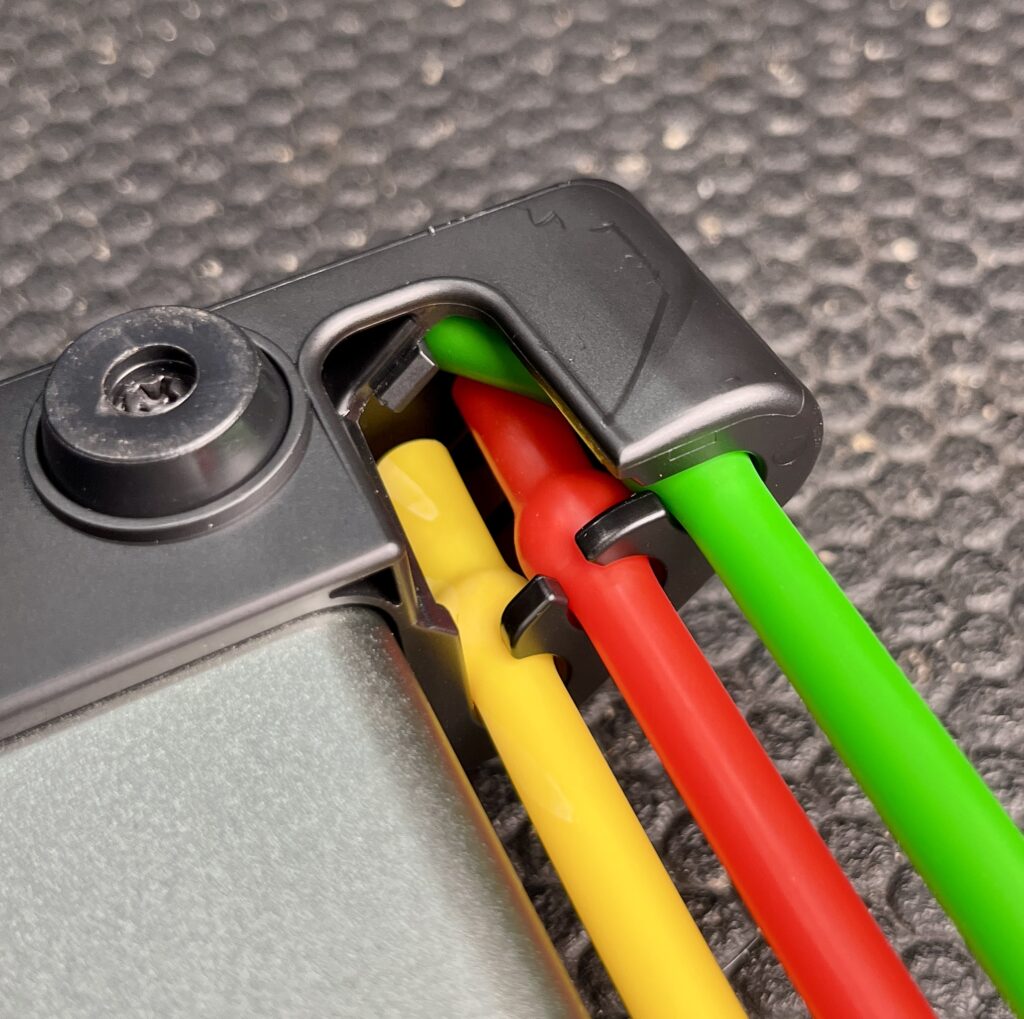 Each resistance band has a bubbled middle that fits into the slot and anchors the band down.
