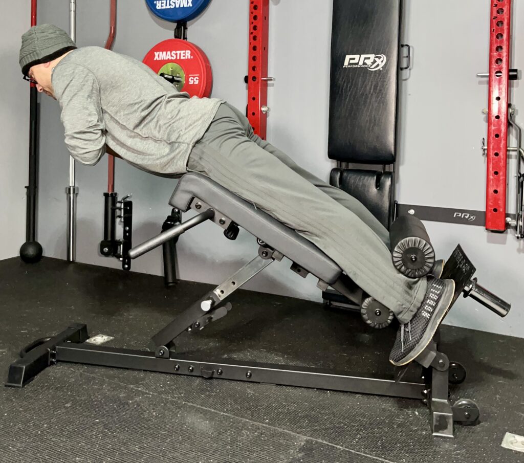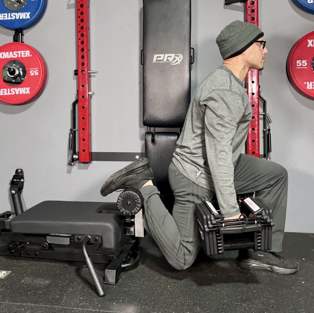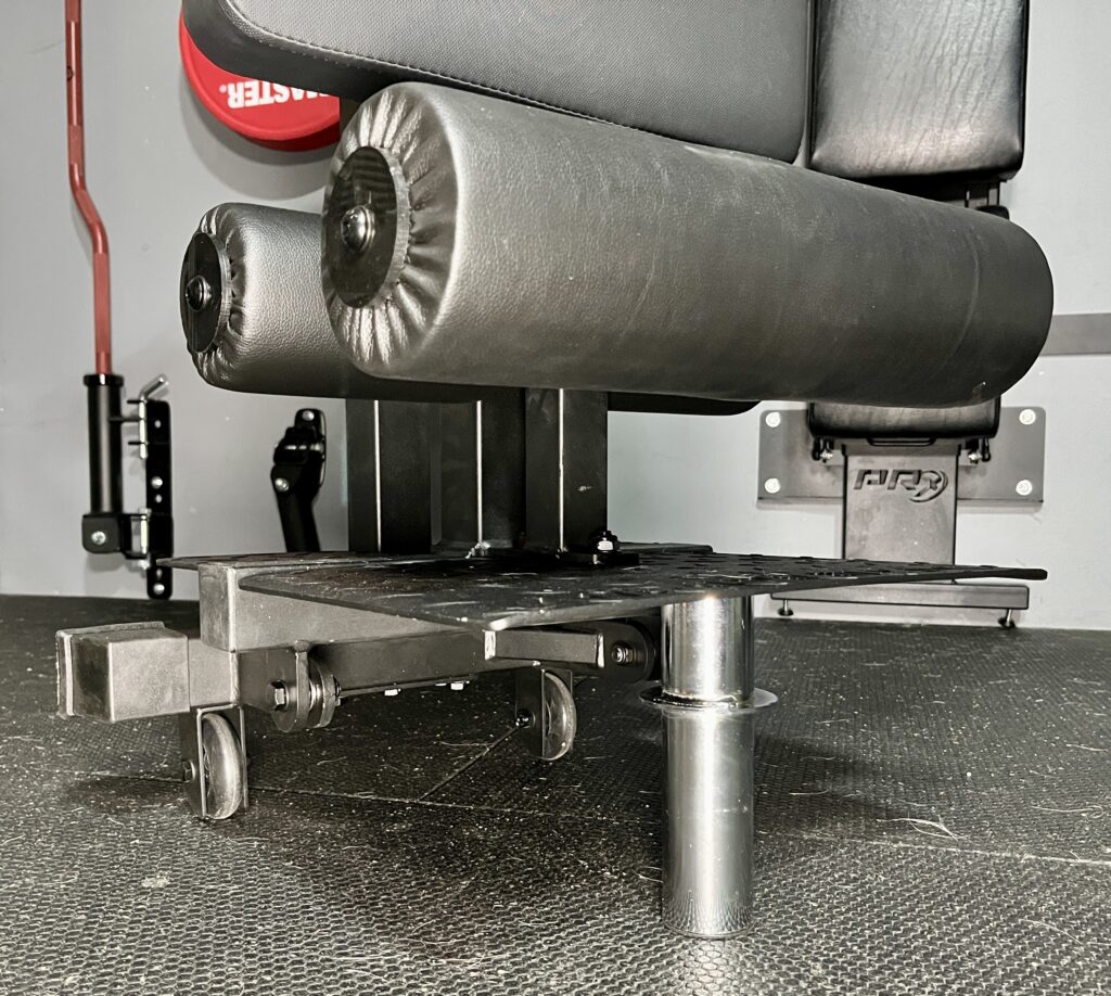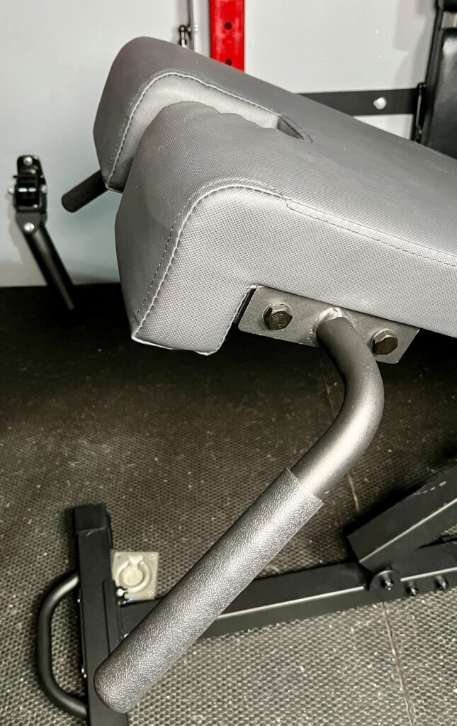 That’s where I connect the detachable leg roller to the front of the bench for other exercises like split squats and hip thrusts.