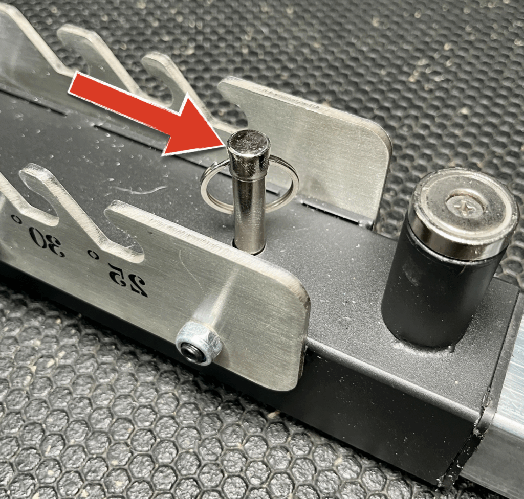 To lock the base in place, I insert a pin in the hole that sits between the adjustment ladder.