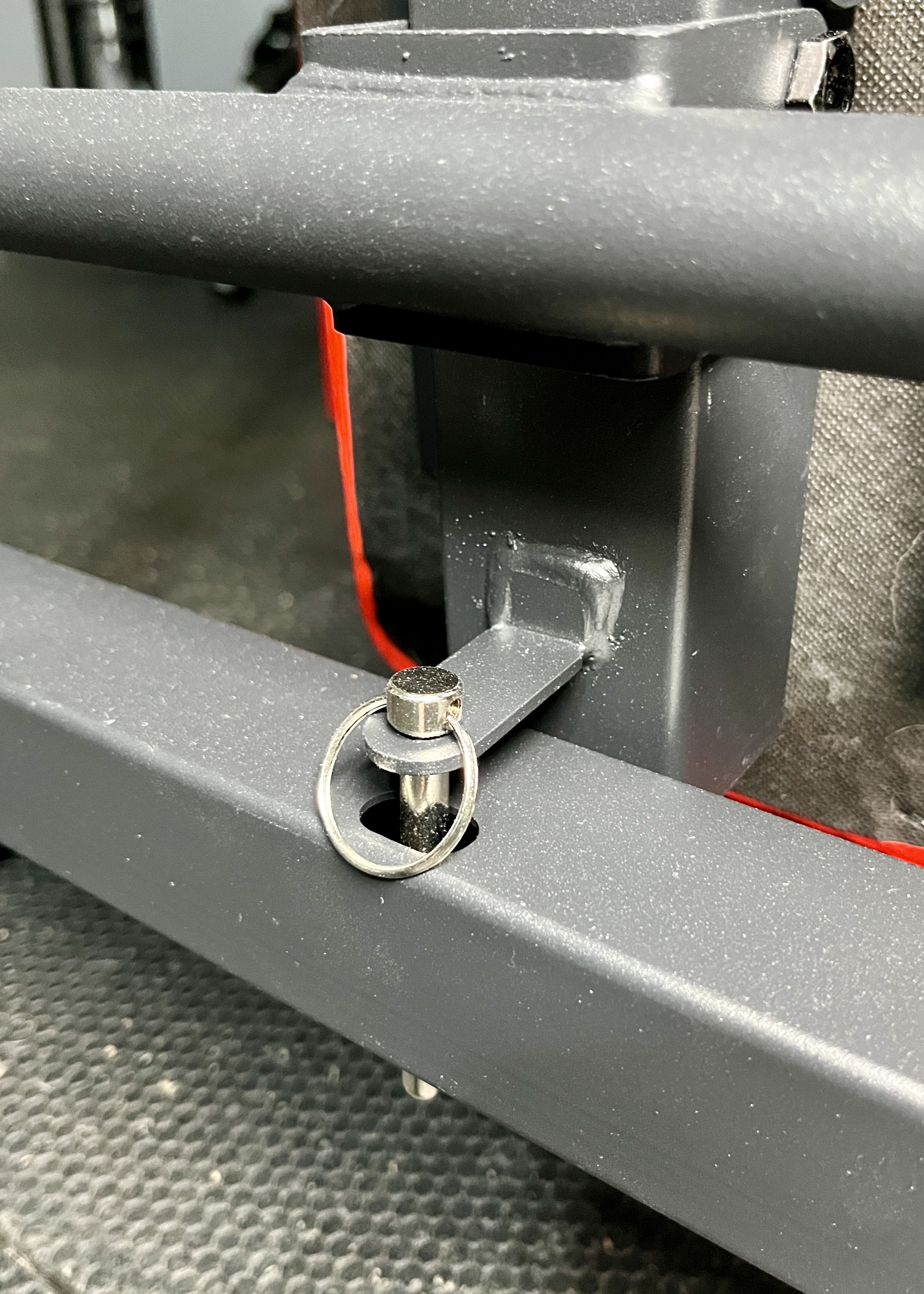 At the bottom, I insert a pin through an L bracket that’s connected to the bench and the crossmember.