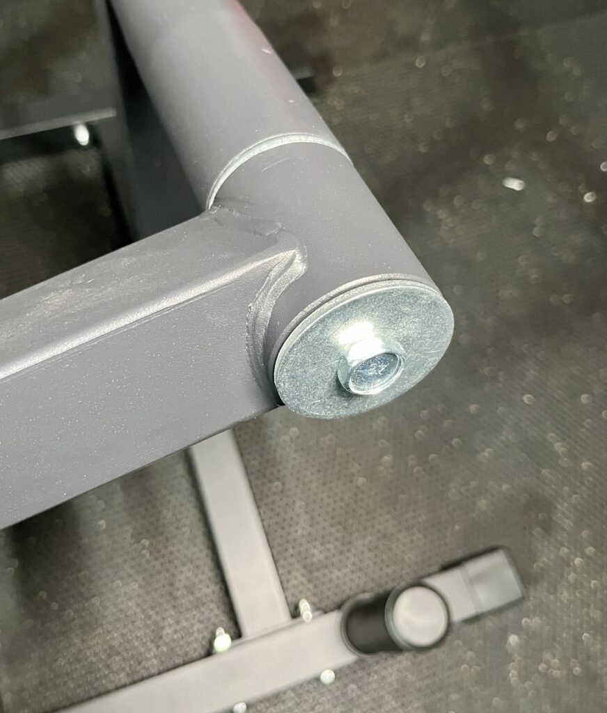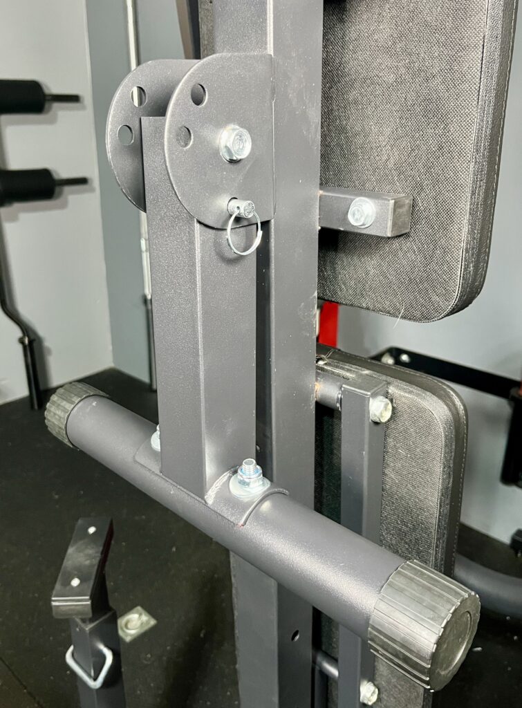 To keep the bench upright, I insert another detent pin between then bench frame post and a crossmember.