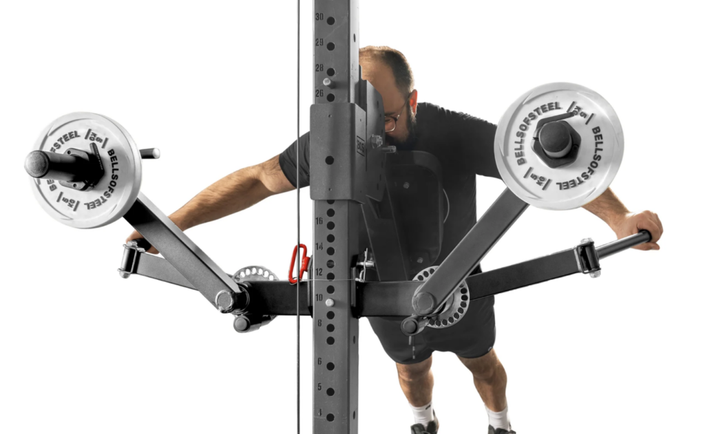 The Bells of Steel Shoulder Boulder is a rack attached machine for side lateral raises, front raises, rear delt flys, and chest flys.