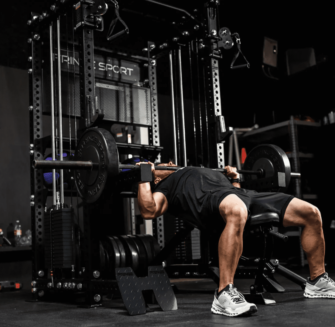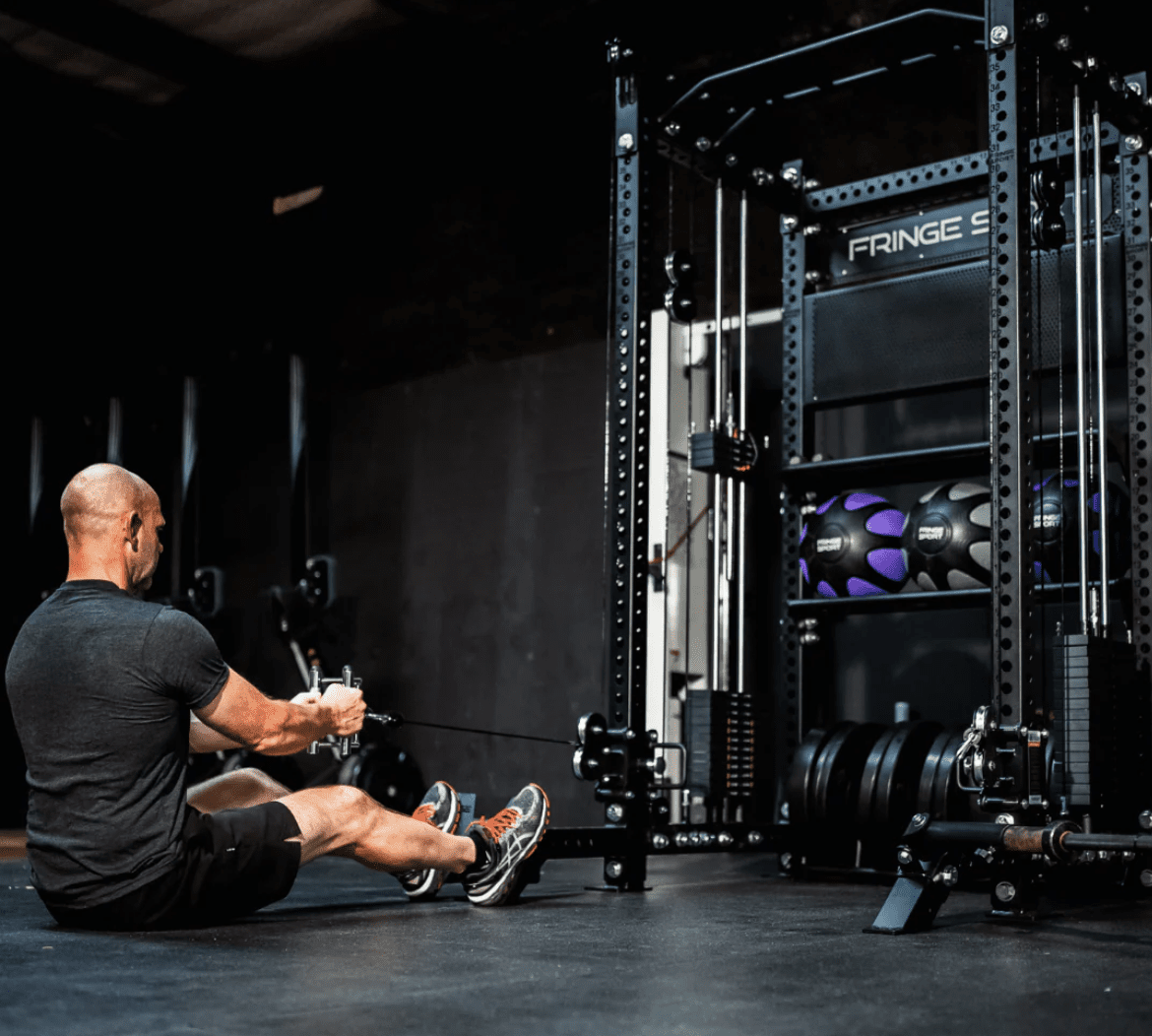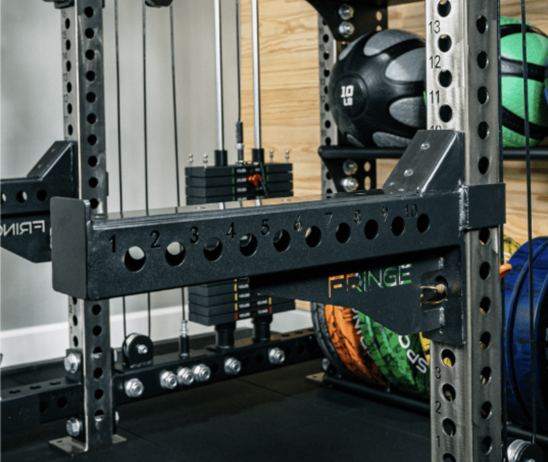 The Dane by Fringe Sport is a half rack functional trainer with a commercial grade pulley system and storage attached to it.