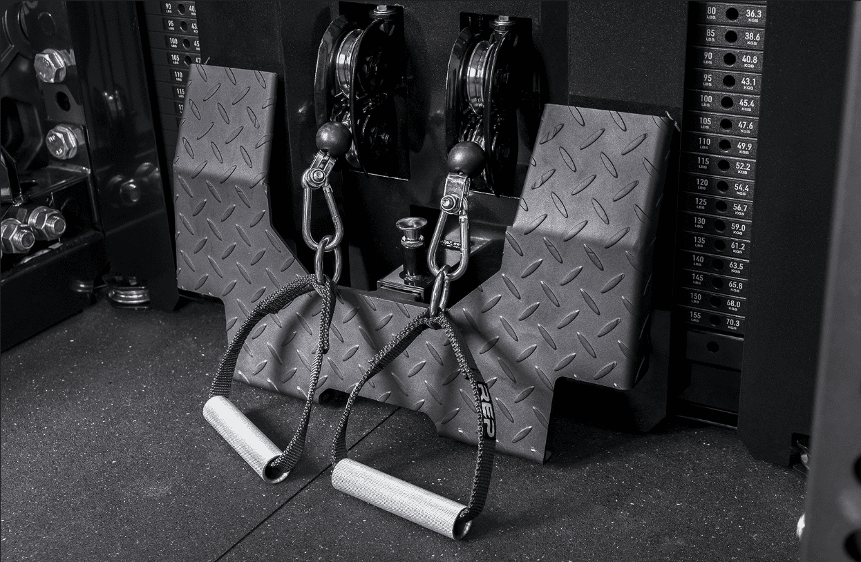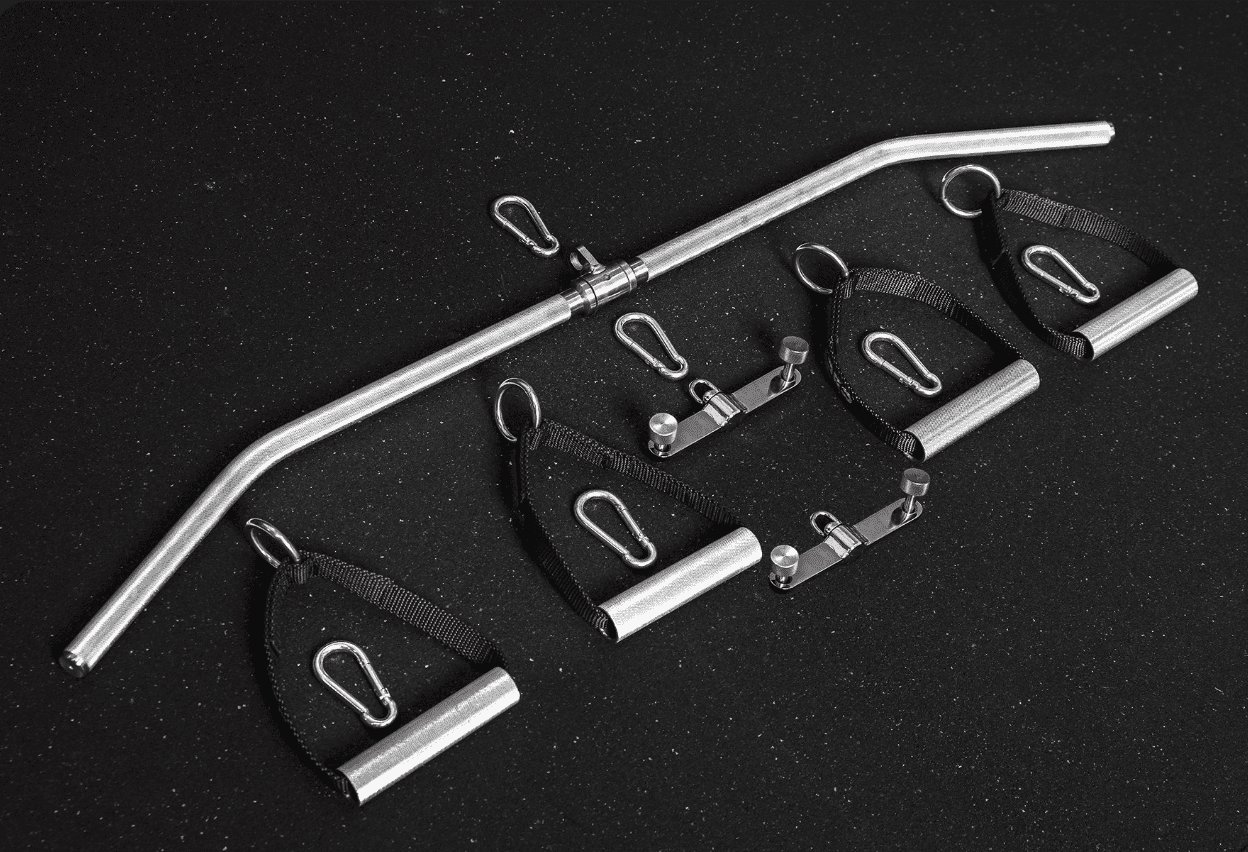 The Rep Fitness Ares 2.0 comes with a lat pulldown bar, 2 clips to connect them to the stack cables, and 4 knurled D-handles.
