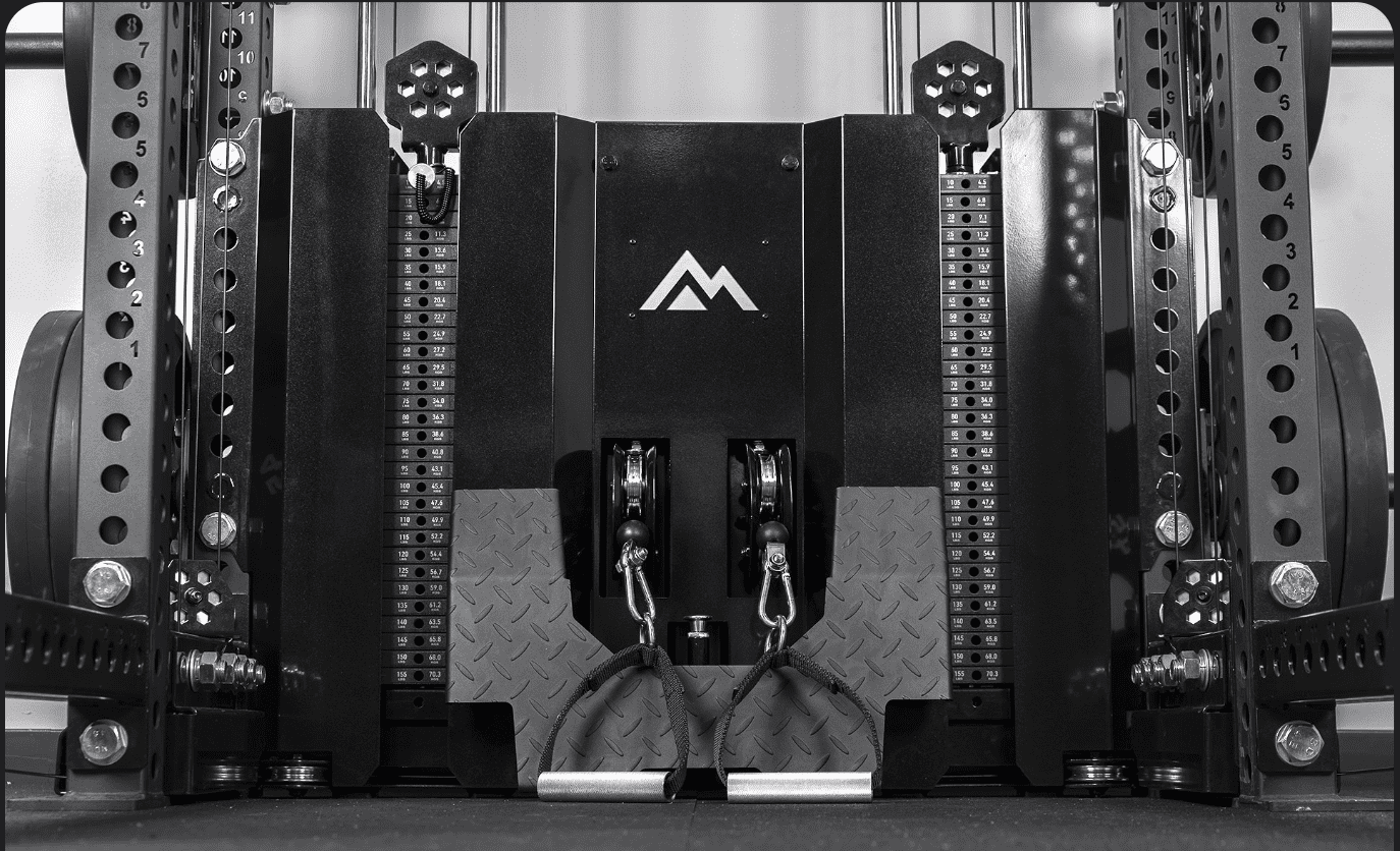 The swiveling front trolley pulleys are positioned further out to provide a greater range of motion that’s more comparable to a stand alone functional trainer.