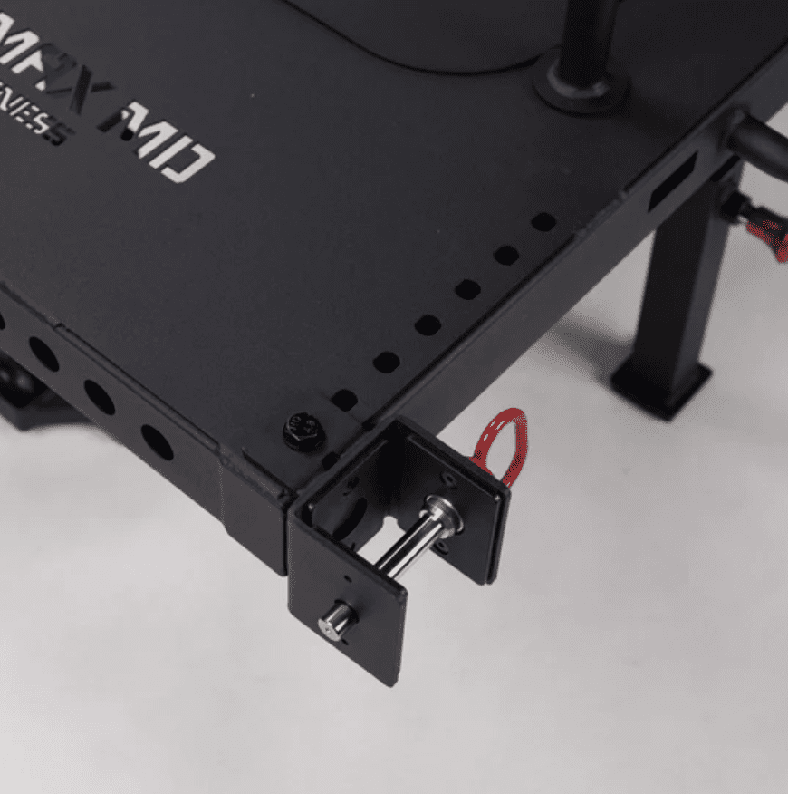 The rack mounted Squat Max-MD is similar to the freestanding version except it has a kickstand and two attachment points for your uprights.