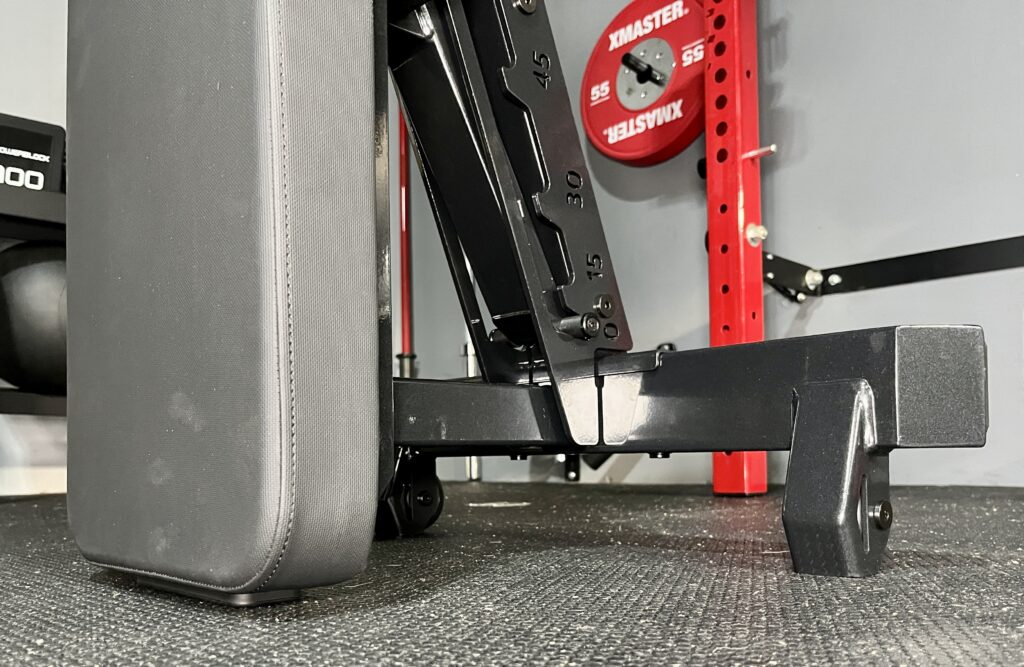 As far as stability goes, the extra 5″ on the rear leg and the wide front leg make the bench very stable.
