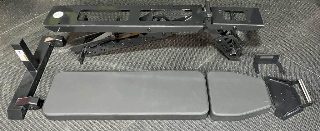 This includes the base, front leg, hind leg, and a piece that protects the vinyl when I stand the bench upright.