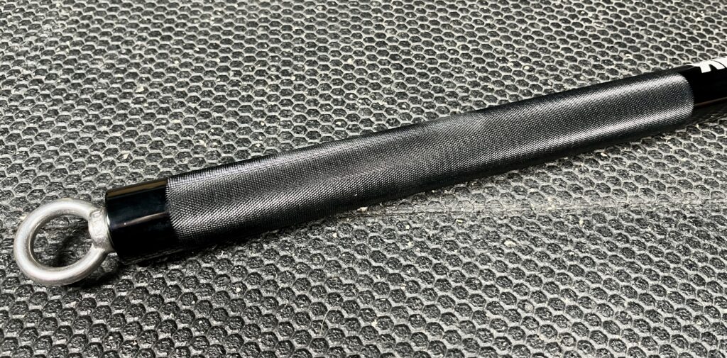 It’s knurled on the sides with a gap in the center and has rotating eye hooks so it’s easy on my wrists.
