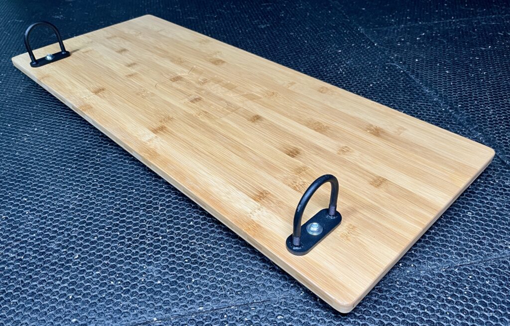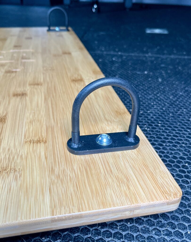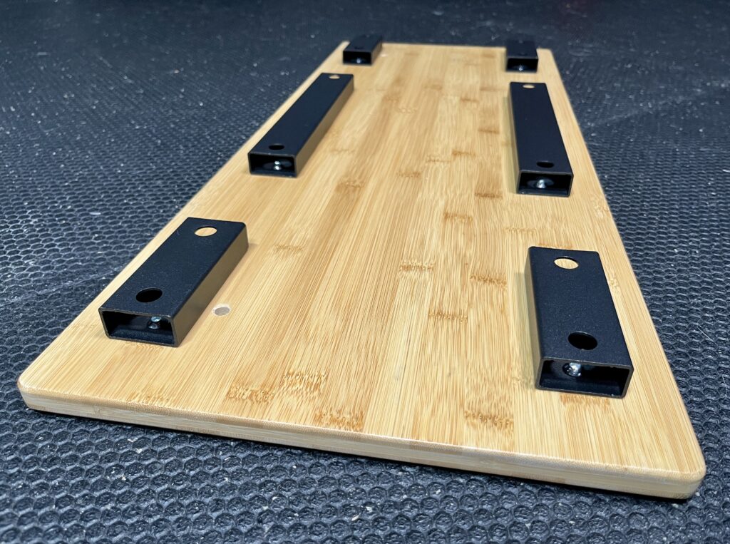 These lift the plate 3/4″ off the floor and create channels to prevent the resistance bands from sliding while I use them.