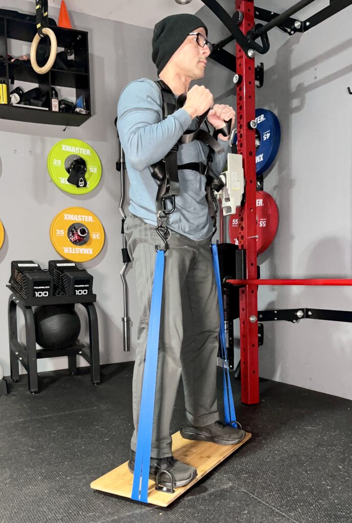The harness’ hooks go on each end of the loop band and help me maintain heavy tension so I feel a challenge when squatting.