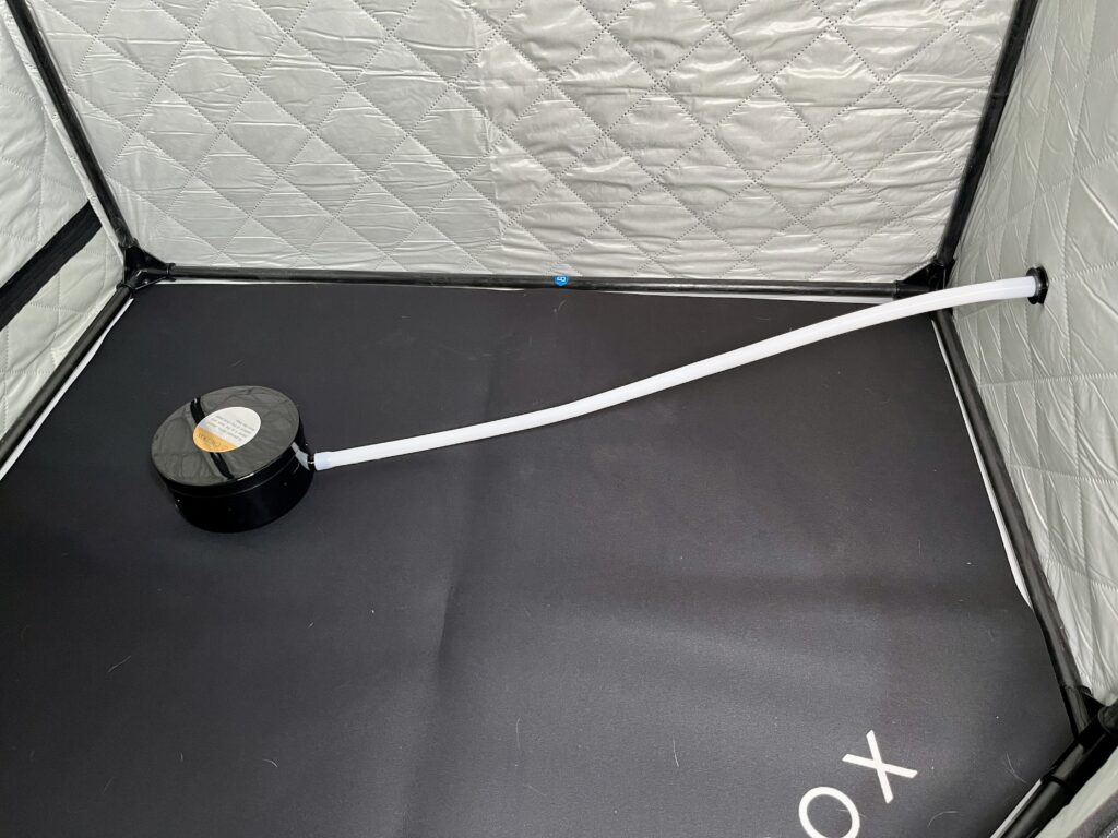 On the bottom right of the Sauna Box, there’s a small hole and this is where I’ll be inserting the tubes from the steamer to the inside of the box.