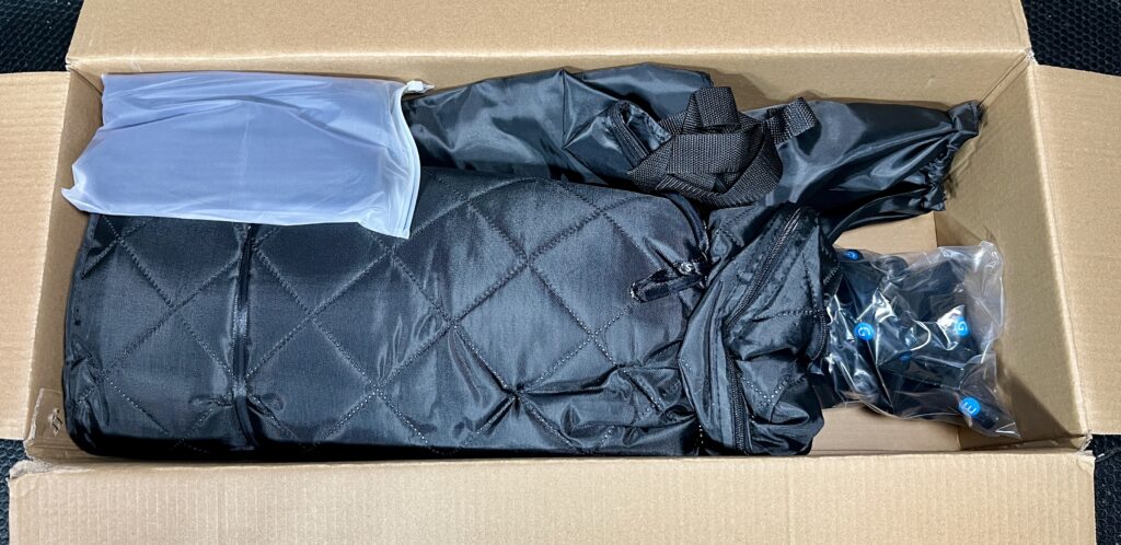 First I opened the long box and it has the cover, a towel, folding chair, floor mat, travel bag, and PVC fittings.