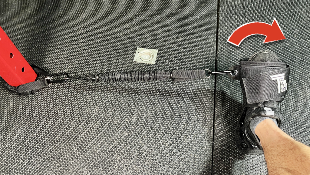 From here, I turn my foot outward against resistance.