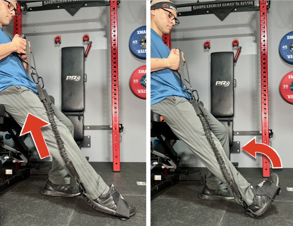 Here I’m doing tib raises with the band anchored to my rack.