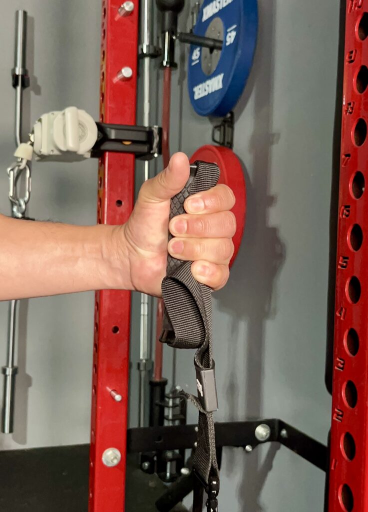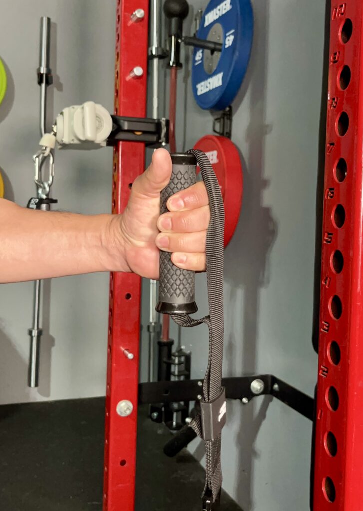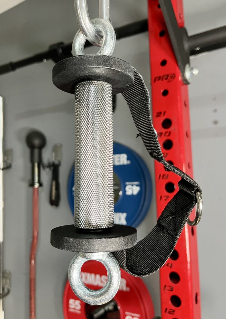 With the addition of eye bolts on the side, the hammer grip allows for unilateral pushing and pulling exercises without the handle strap getting in the way.