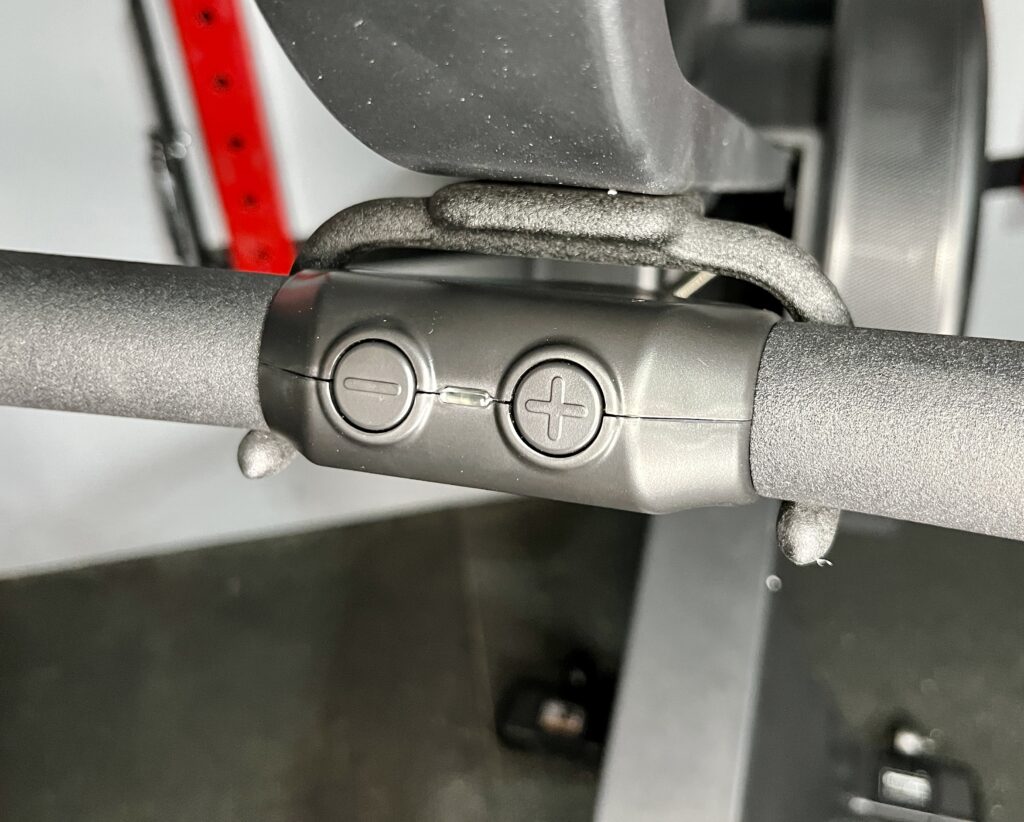 Once it’s plugged in, I can increase or decrease magnetic resistance by pushing the ( + ) or ( – ) buttons on the middle of the handlebar.